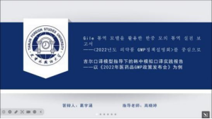 天津外国语大学葛宇涵同学在吉尔口译模型指导下,以《2022年医药品GMP政策发布会》为例,撰写了韩中模拟口译实践报告,验证了吉尔模型对于医疗领域韩中交替传译的指导意义,证明了该理论在指导口译实践方面的优越性,完善了理论与实践的结合程度。张浩然同学以先行谓语限制为例对韩国语‘-었-’与汉语‘了’进行了对比研究,在语言学研究上具有较高的理论和研究意义。