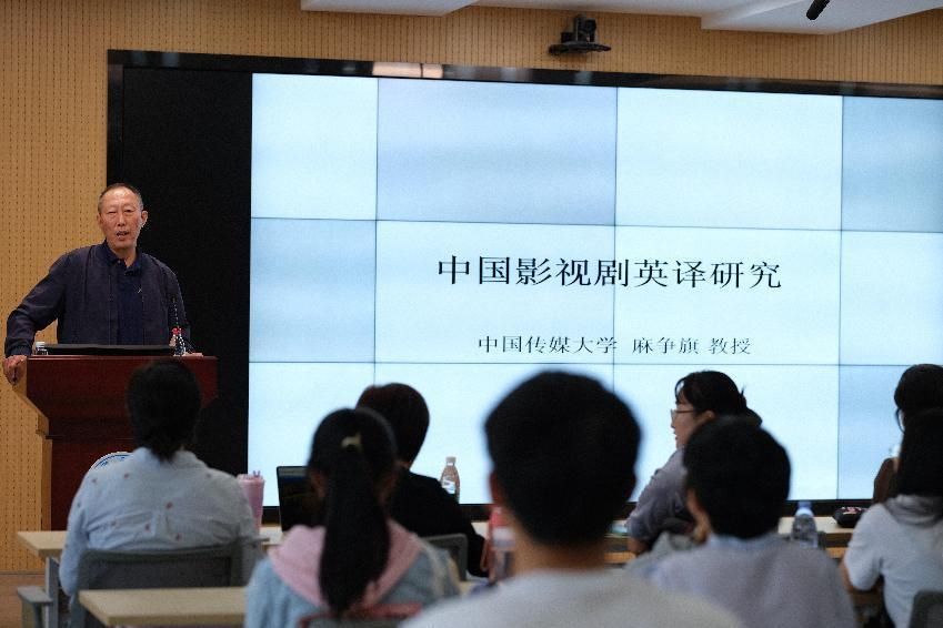 麻争旗教授以“中国影视剧英译研究”为题,为与会师生带来了一场视听盛宴。他谈到,中国的影视剧翻译已经由“翻译世界”过渡到了“翻译中国”,中国影视剧的英译正成为翻译学界的关注重点,同时,影视剧翻译有其独特的审美特征及艺术要求。