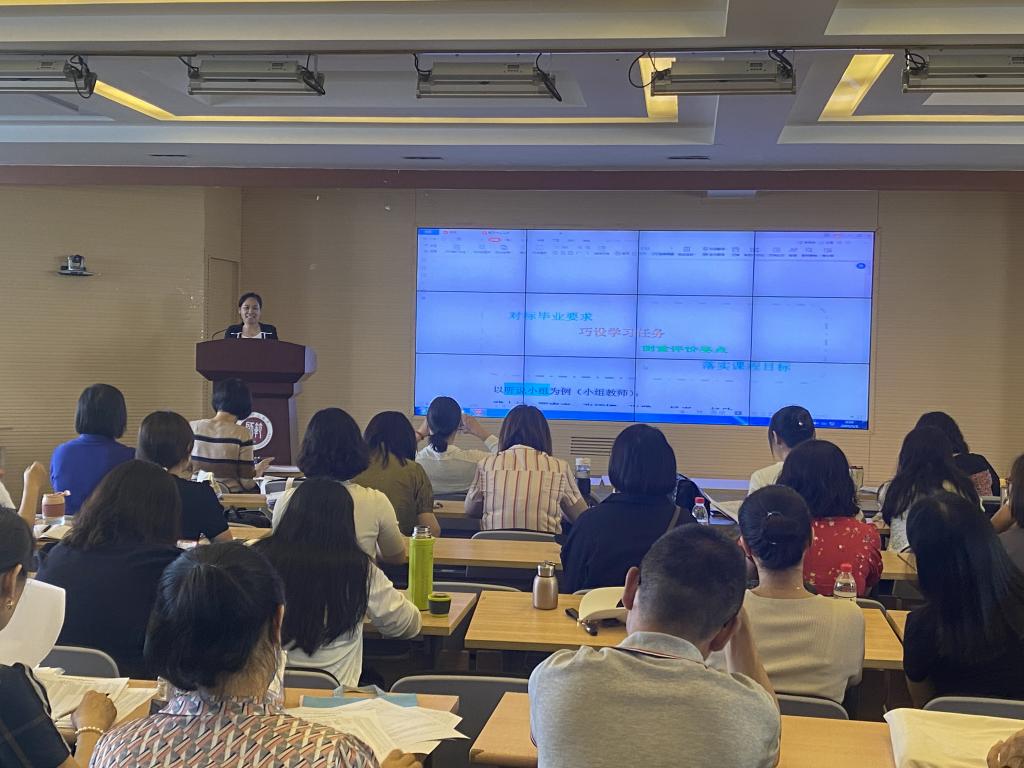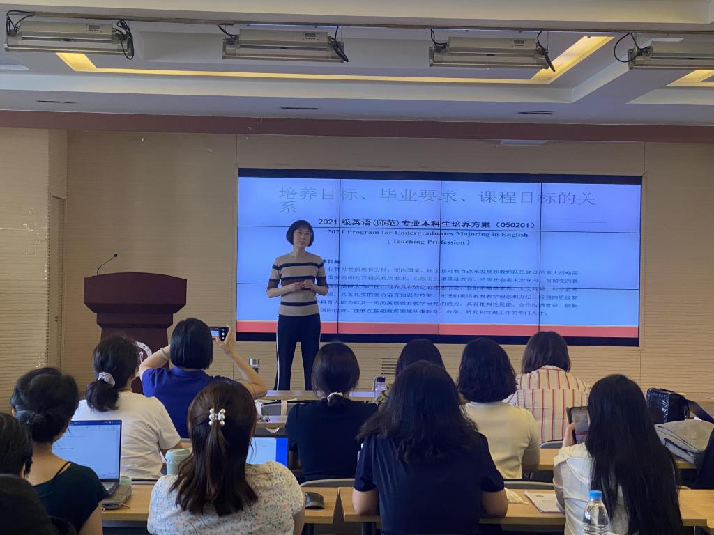 杨艳老师以“对标毕业要求、巧设学习任务、侧重评价要点、落实课程目标”为题,详解“教学能力、师德师范、技术融合、国际视野”等毕业指标点要求,分享了在设定课程的具体教学目标、设计教学内容和实践任务、侧重具体评价点、确保课程目标达成度的经验和感悟——新时代背景下的外语教学变革,已不再是单纯的技能训练和知识整合,更多地要依托语言实践活动来提升员工的教学能力、信息技术应用和自主合作学习能力,开阔他们的国际教育视野,在新文科视域下增强员工的获得感,助力他们的专业成长。