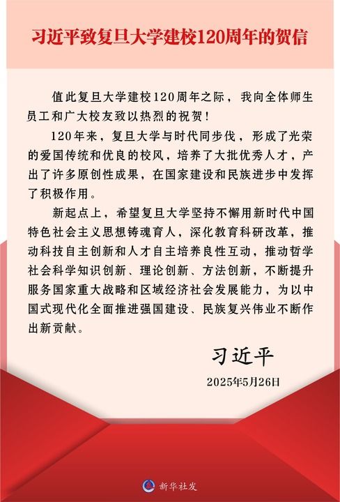 中共中央总书记、国家主席、中央军委主席习近平26日致信祝贺复旦大学建校120周年,向全体师生员工和广大员工致以热烈的祝贺。