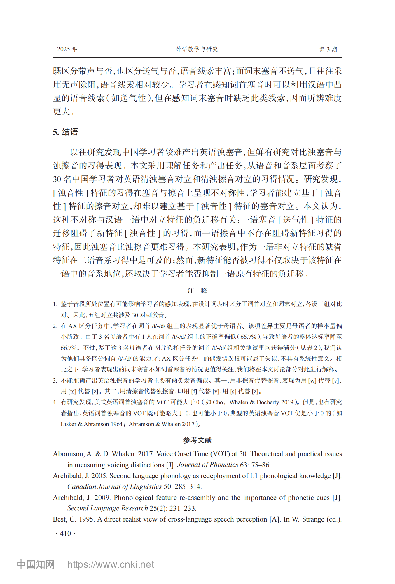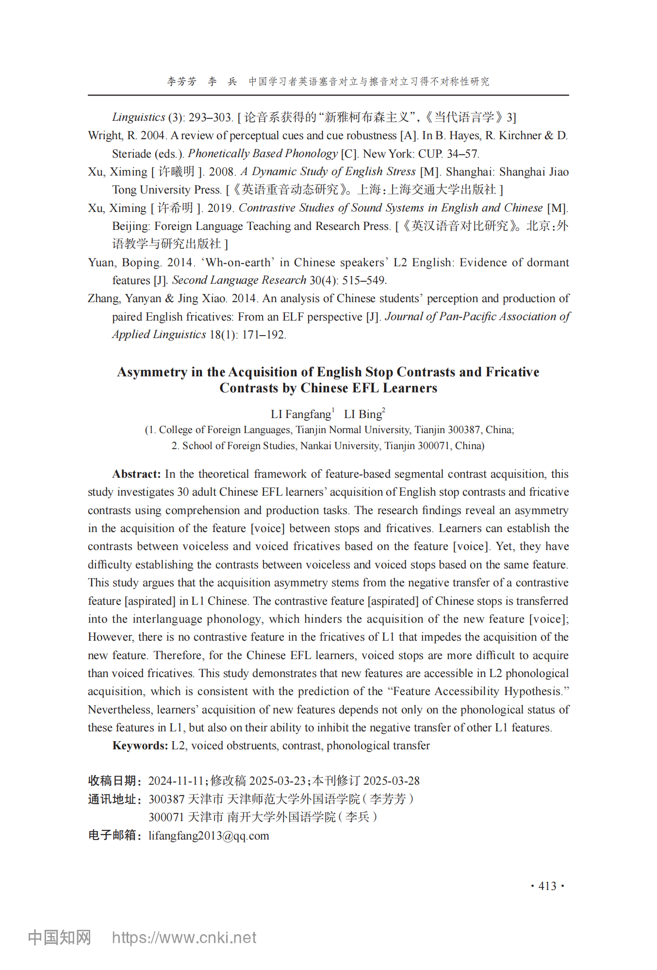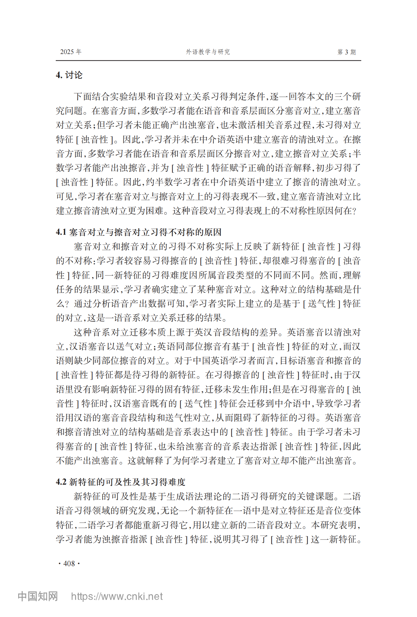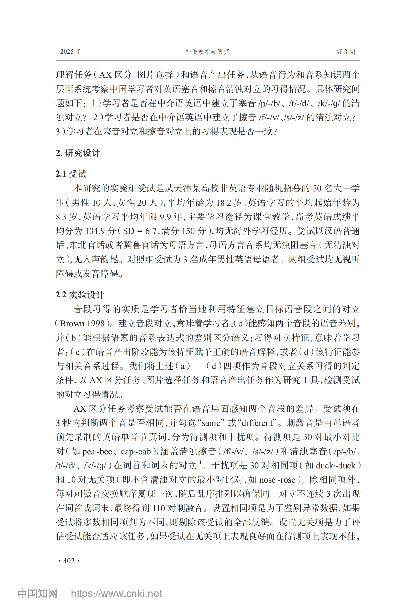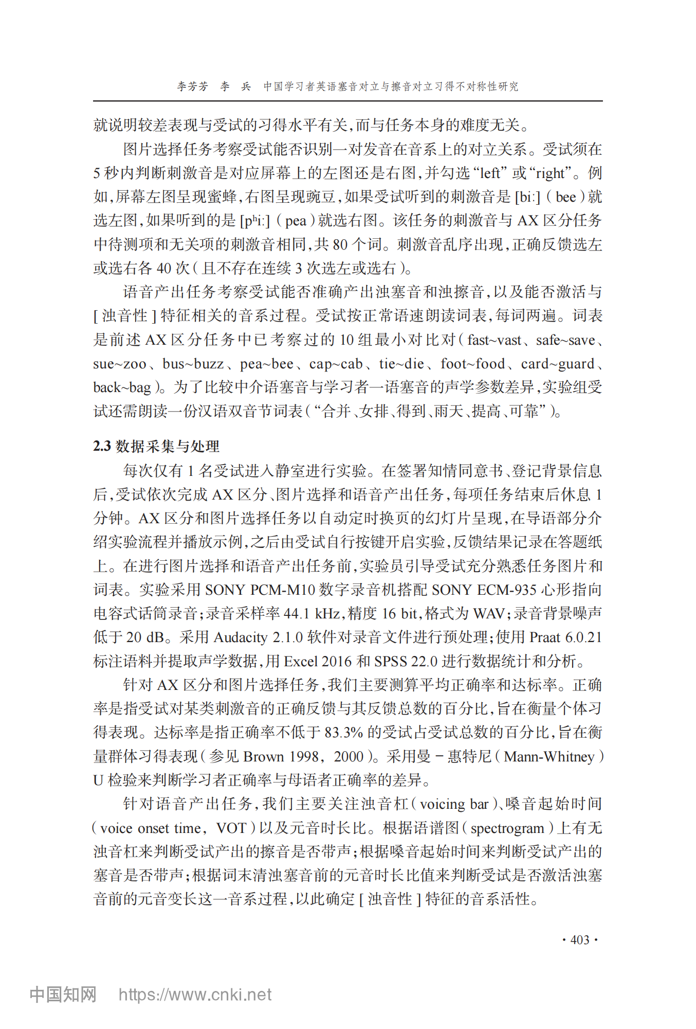 参考引用格式:李芳芳,李兵.中国学习者英语塞音对立与擦音对立习得不对称性研究[J].外语教学与研究,2025,57(03):400-413.DOI:10.19923/j.cnki.fltr.2025.03.010.