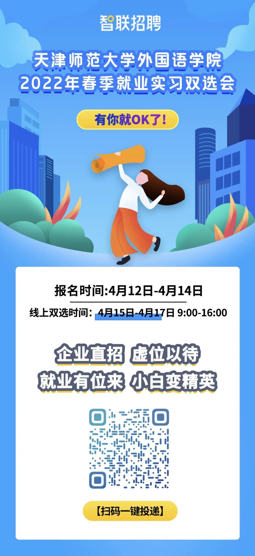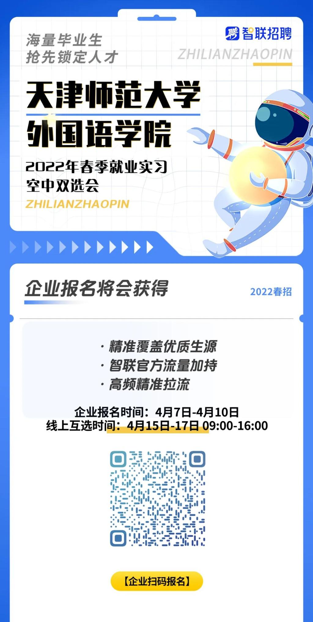 为搭建毕业生和用人单位之间的双向选择平台,实现精准推荐、精准对接、合作共赢,全力做好线上招聘的组织与服务。伟德体育官方网站特联合智联招聘定于2022年4月15日-17日举办“2022年春季空中就业实习双选会”,现诚挚邀请贵单位前来公司招聘英才。