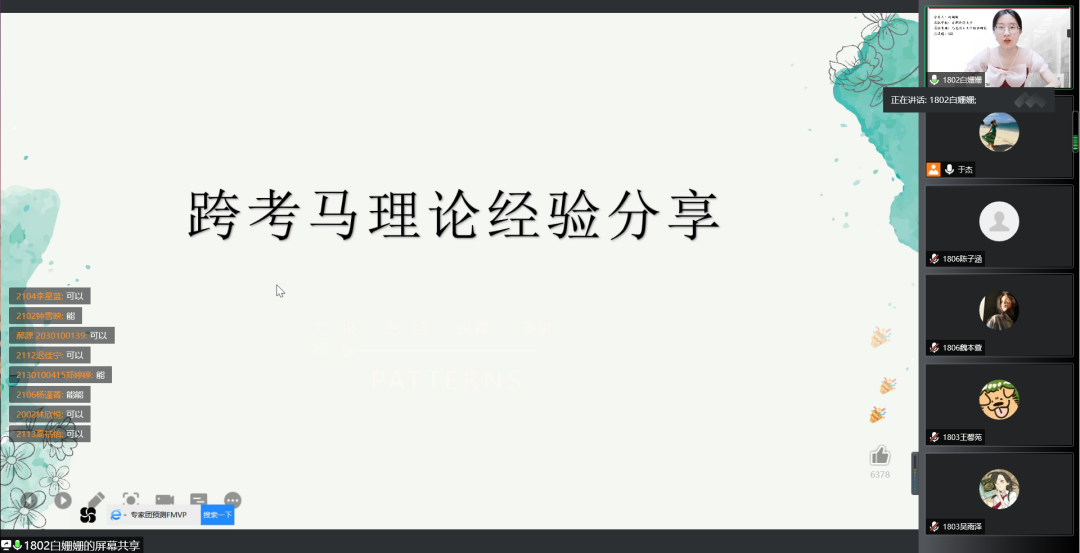 会议伊始,于杰老师简要分析了今年的考研情况,并向从千军万马中脱颖而出的上岸学子们表示了祝贺。三十四位“英雄”的影像在屏幕上接次播放,这是他们四年本科生活一个完美的句号。