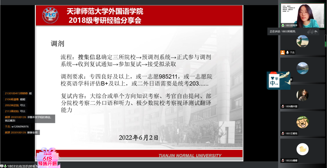 吴雨泽同学则向同学们分享了调剂的经验,为同学们讲述了调剂的条件限制和复试的注意事项。面面俱到的讲解让同学们受益匪浅。