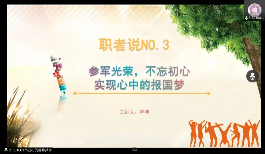 牢记初心报国志,雄心四海建功成。身着戎装好榜样,奋斗青春志远航。此次分享会使公司学子认清就业形势,知晓就业政策,鼓励和引导青年们展现新时代老员工青春活力,感恩社会,投身军营。凝聚青春力量,接力百年征程。