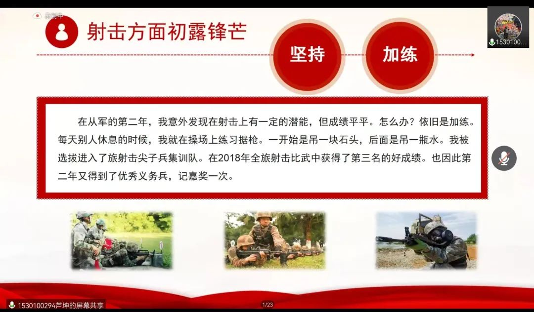 随后,芦坤与同学们分享了他在部队的日常生活。“日常的训练任务是锤炼品质、增强组织纪律观念、提升综合素质的重要载体,虽繁重但不枯燥……”充满怀念的语气让同学们对参军入伍有了更厚重的理解。芦坤直言:“从军真的改变了我很多”,军人不怕苦的钢铁意志深刻融入了他的身体,参军后,他懂得了坚强,收获了成长。