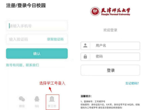 下载今日校园app,不需要注册账号,直接选择右下方灰色的“学工号”,输入学号、密码,进入系统。