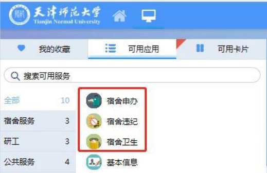 由伟德体育官方网站“网上服务大厅”(http://ehall.tjnu.edu.cn/new/index.html),点击“员工办事”,在“账户登录”位置输入学号、密码,点击登录,在页面左侧“可用应用”中查看宿舍申办、宿舍违纪、宿舍卫生等应用。