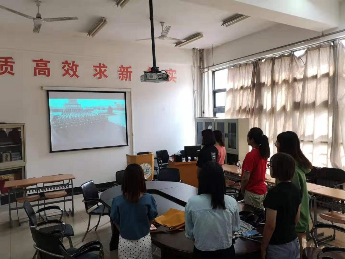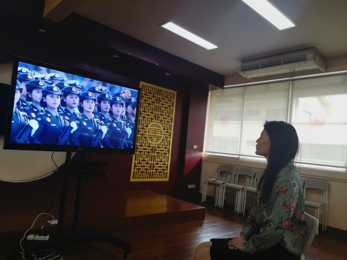 *为了让更多的同学观看国庆直播,公司党委副书记刘晓蕾同志、资料室主任陈巍同志组织在校师生党员代表在公司小会议室集体观看直播*