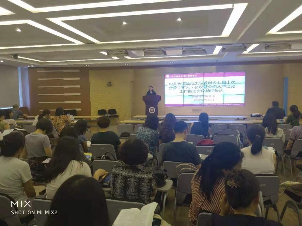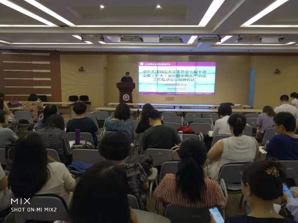 会上,公司党委书记张维和同志首先就公司党委七届十次全委(扩大)会议暨全面从严治党工作推动会议精神向全体教工进行了传达。首先,张维和同志重点向全体教工传达了公司师范类认证、学科评估、聘期考核等2019年下半年各项重点工作精神进行了传达,同时还就“不忘初心、牢记使命”主题教育、师德师风建设、巡视整改等全面从严治党工作进行了传达部署。随后,张维和同志向全体教工通报了近期我市市管领导干部违纪问题典型案例,再次开展警示教育,强化纪律观念和纪律意识。会后,公司还将以各系部为单位组织专题学习和研讨,进一步领会公司党委会议精神。